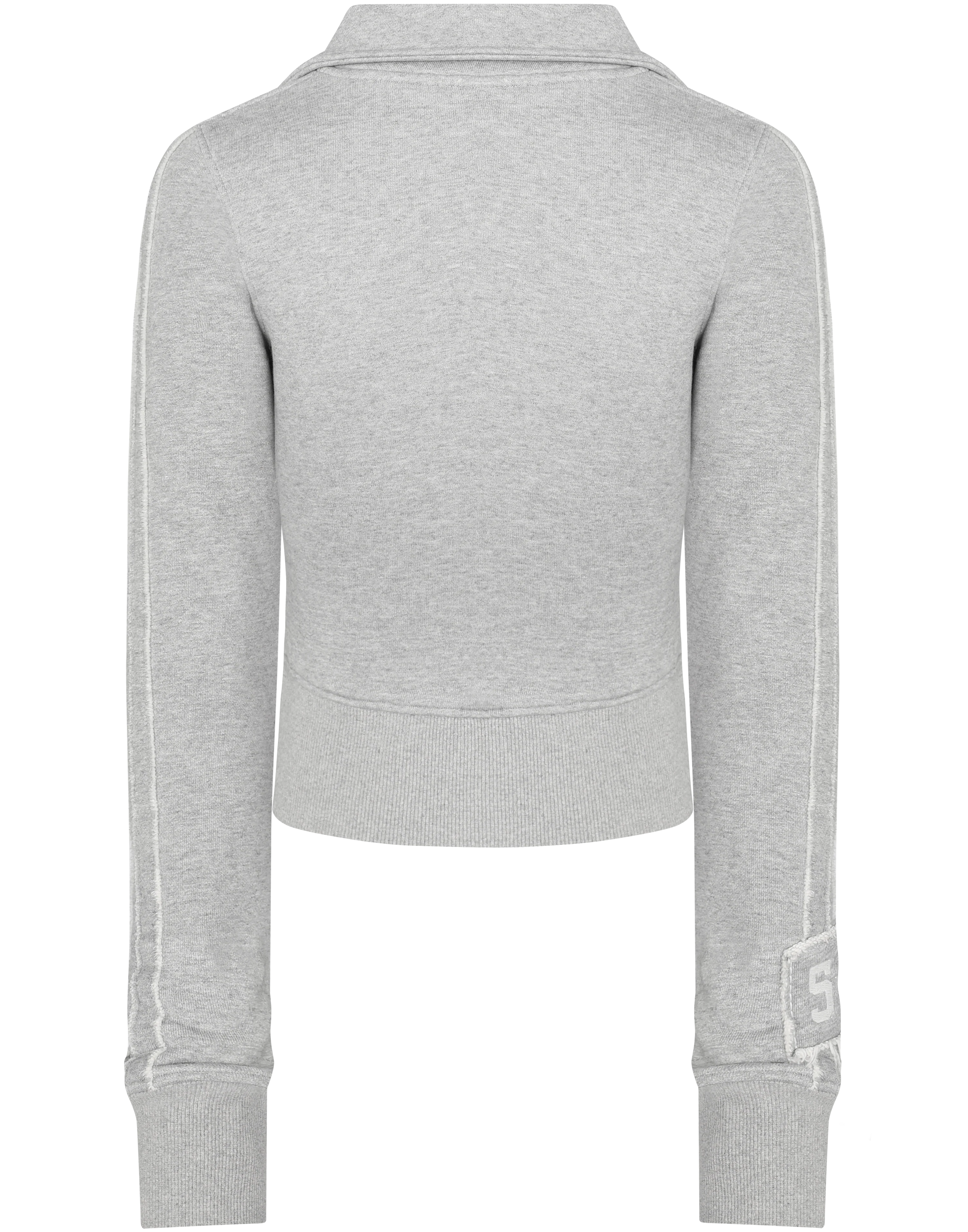 HIDDEN CULT® Original design. This zip track jacket sweater is crafted from our premium extra-heavy 100% cotton fabric with distressed details on the front and custom distressed sleeve stripes. Features embroidered distressed star patch on right sleeve, thick custom stitching, and a track jacket collar. Includes a two-way double zip with signature engraved hardware for versatile styling.