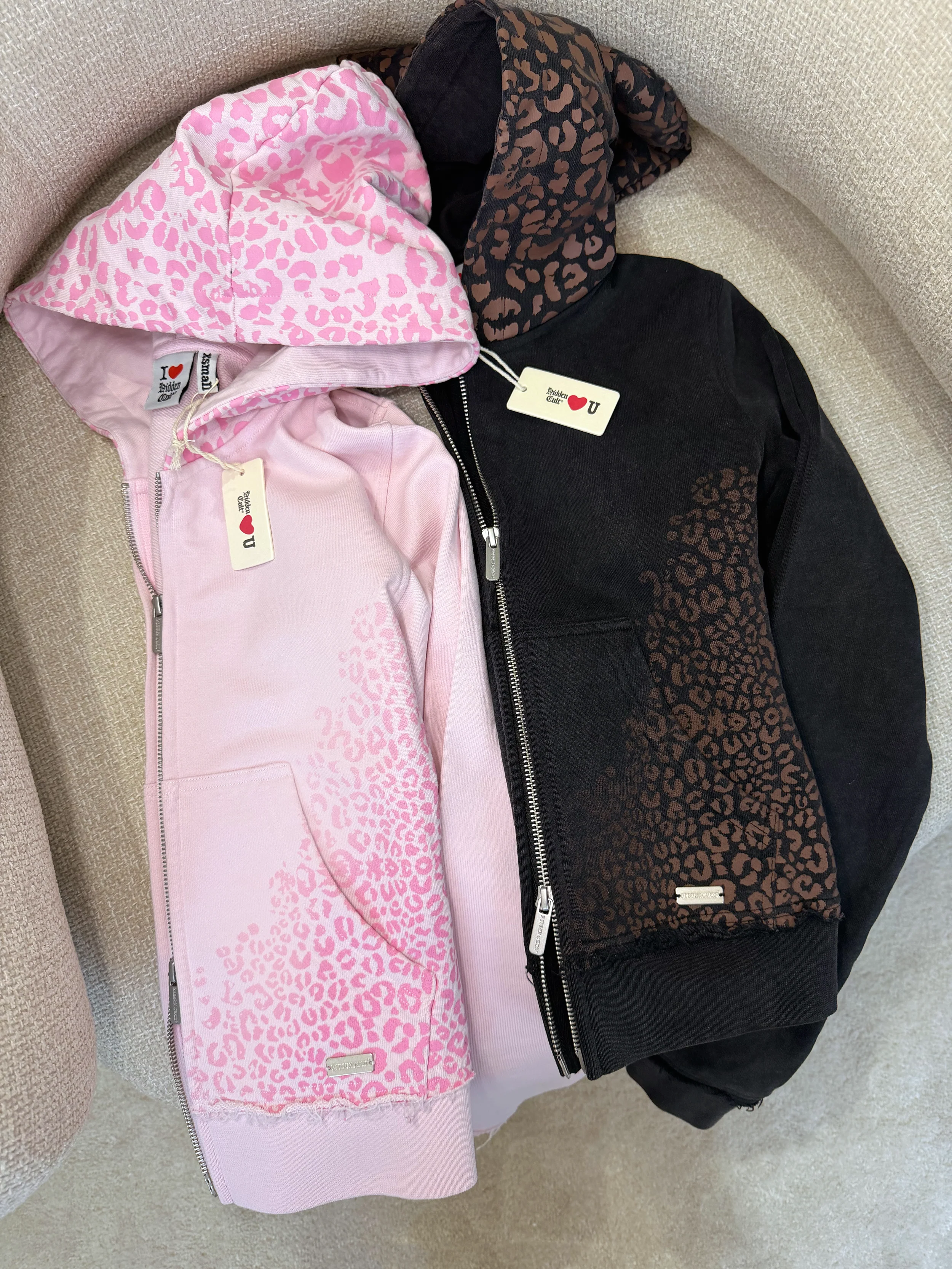 Original design by HIDDEN CULT®. Limited edition for Black Friday 2025. Crafted from premium 100% GOTS-certified cotton, this baby pink zip hoodie is designed with a true-to-size fit and soft stretch waist. Featuring a gradient pink cheetah print hugging the waist and a matching cheetah pattern on the hood. Detailed with distressed trims at the waist and cuffs, a two-way matte silver zipper with engraved pullers and elastic wrist cuffs for comfort.