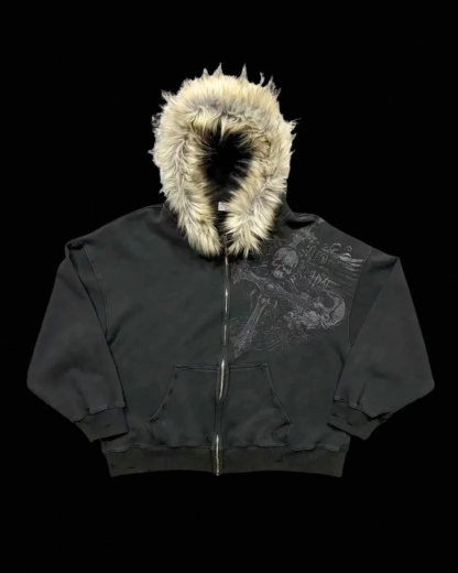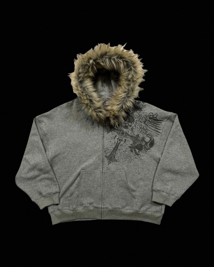 Heather-grey full-zip hoodie with a faux-fur trim hood and gothic winged skull graphic at the shoulder. Relaxed fit with split kangaroo pockets and ribbed cuffs/hem—warm and statement-making. Cotton blend, true to size, and ready to ship.