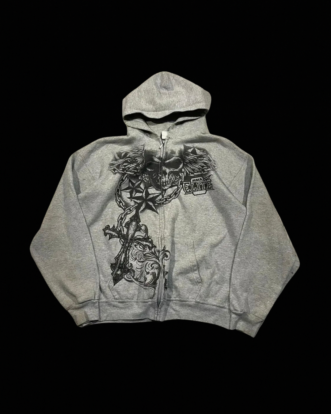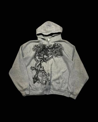 Heather-grey full-zip hoodie with a bold front hit—winged skull, chained star, and ornate cross graphic cascading down the torso. Mid-weight, relaxed fit, split kangaroo pockets, and ribbed cuffs/hem. Bend, true to size, and ready to ship.