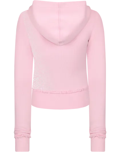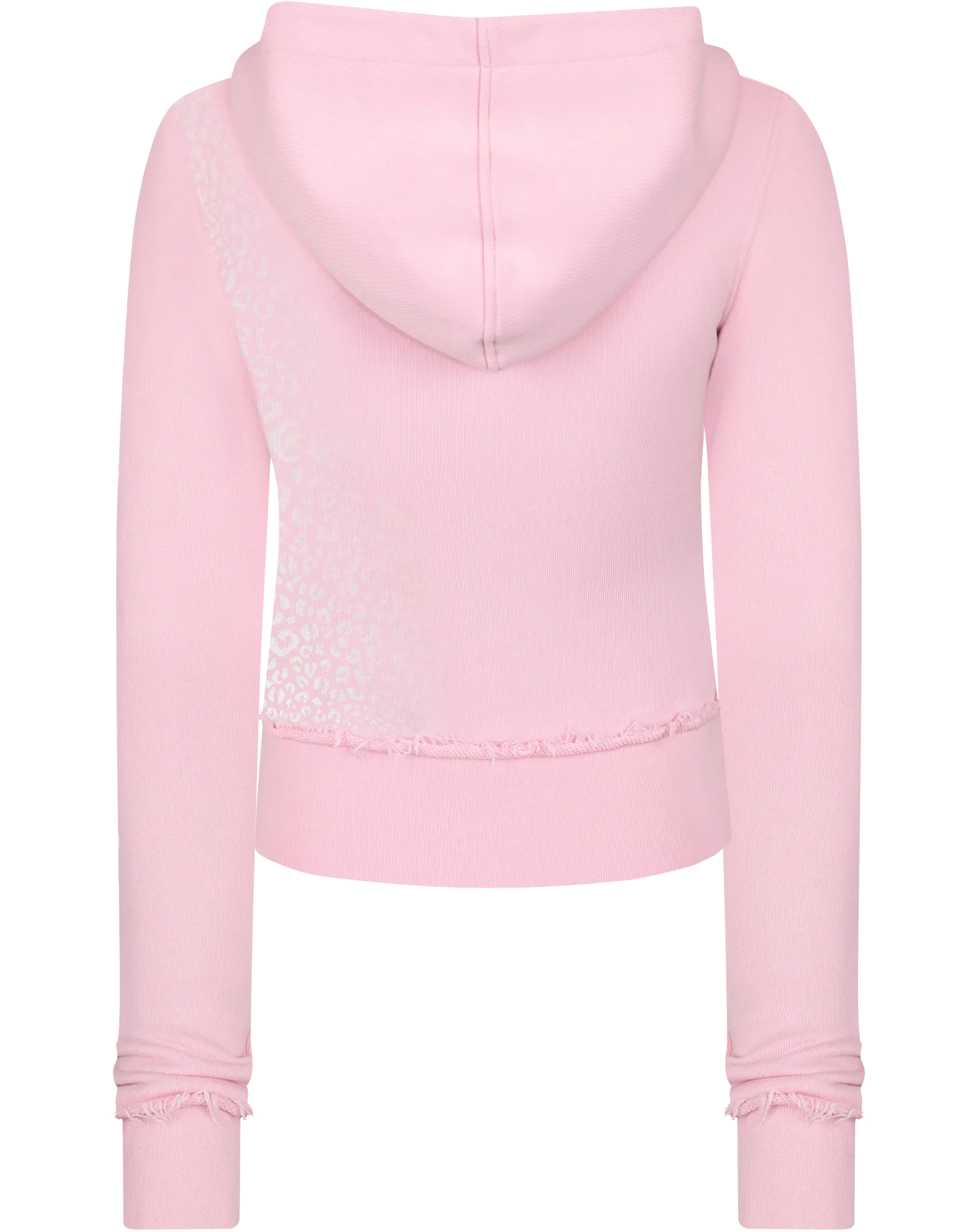 Original Design by HIDDEN CULT®. Crafted from premium structured 100% GOTS certified cotton, this baby pink zip hoodie is designed with a snug fit and soft stretch waistband. Featuring a gradient white cheetah print, distressed trims at the waist and cuffs, a double zip opening with engraved pullers and elastic soft stretch cuffs for comfort.