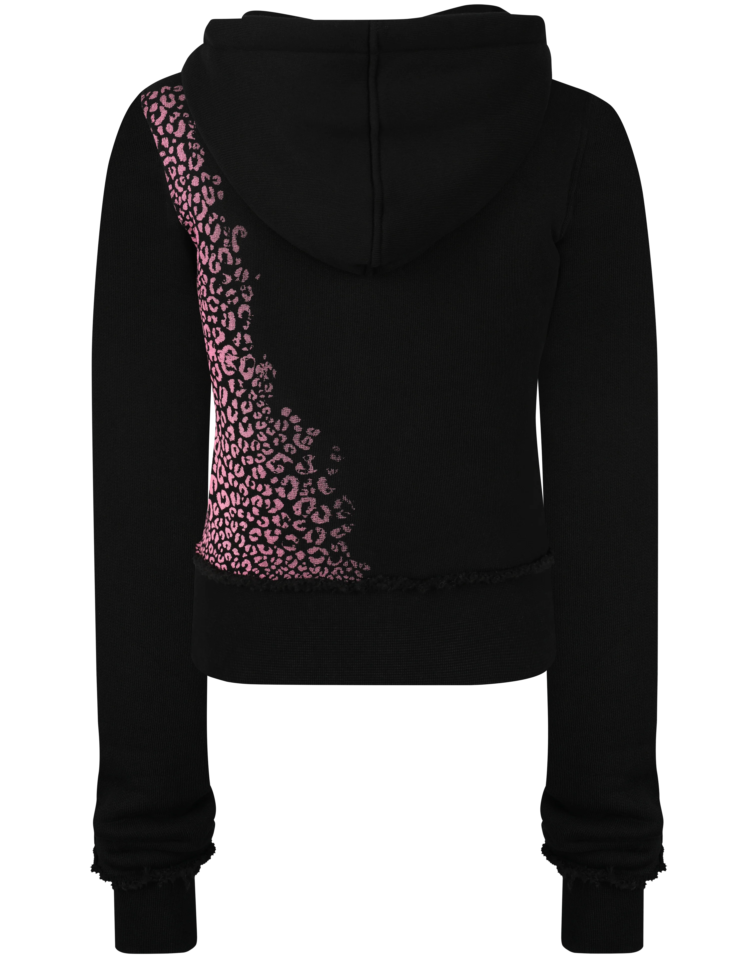 Original design by HIDDEN CULT®. Plush lined zip hoodie with a snug, flattering fit. Ultra soft feel with medium stretch for all day comfort. Features pink cheetah print, distressed trims, a double zip opening, engraved hardware, and elastic wrist cuffs.