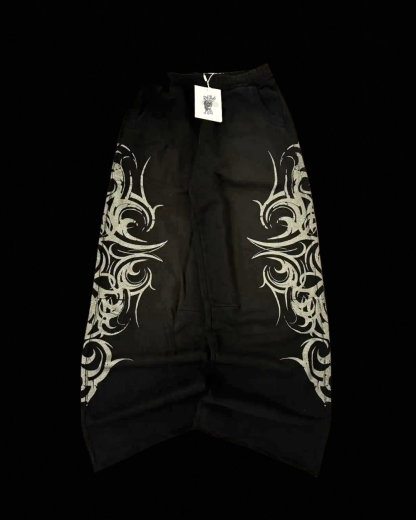 Heather-grey sweatpants with oversized mirrored tribal prints down both legs. Mid-weight feel with elastic waistband, drawstring, side pockets, and raw hem for a relaxed, stacked fit. Cotton blend, true to size, and ready to ship.